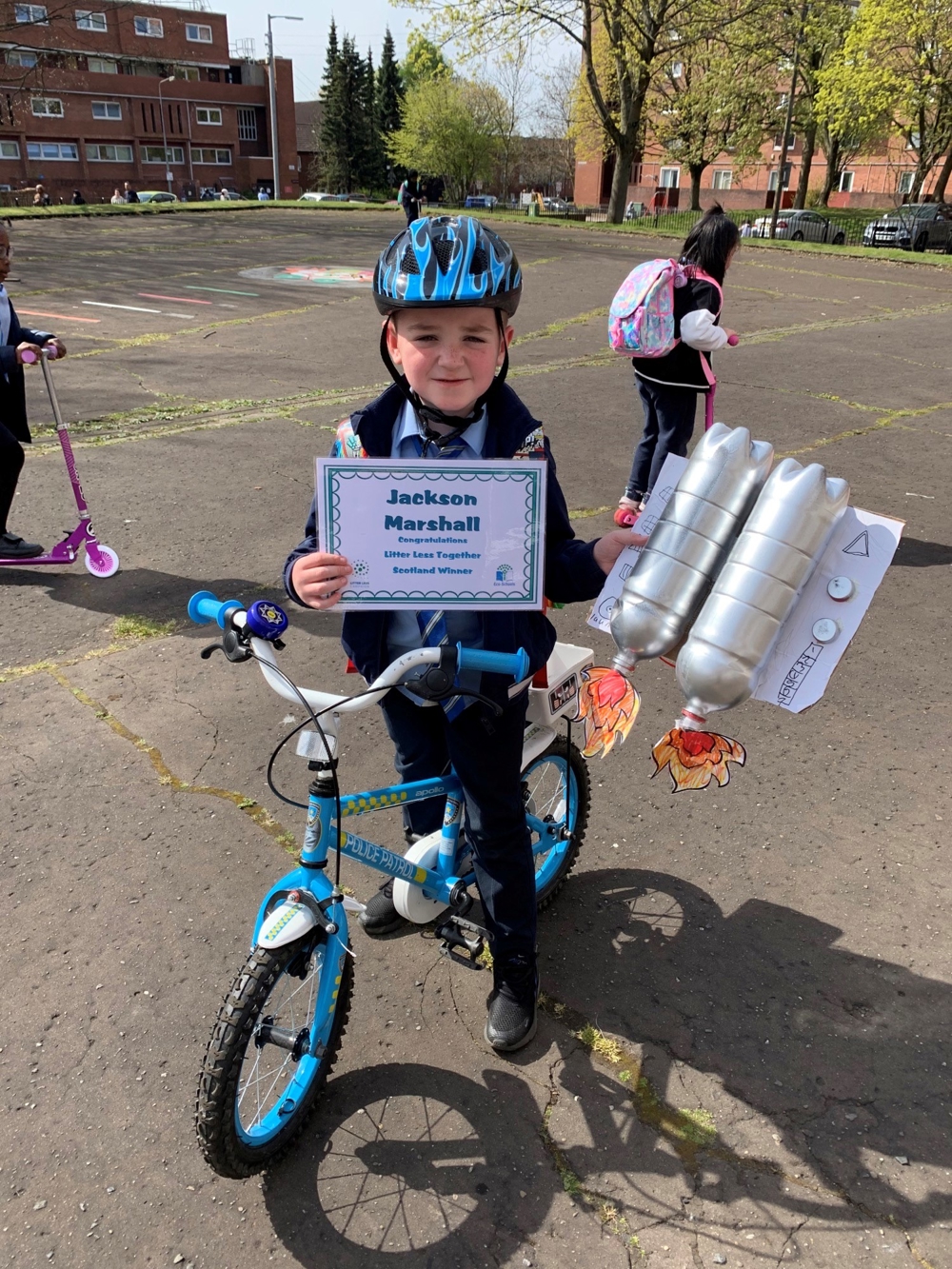 Our Key Worker children enjoyed these experiences and we created a display wall with their learning. Children working remotely also engaged in various learning activities, although not as prescriptive as our children in school. We also decided it wasn’t appropriate or safe to ask our pupils to litter pick at home given our urban, city centre location. All, however, were encouraged to take part in the #Litterlesstogether competition. Our P1 pupil, Jackson, was delighted to win with his junk model and is now excited to be put forward to represent Scotland later this year.