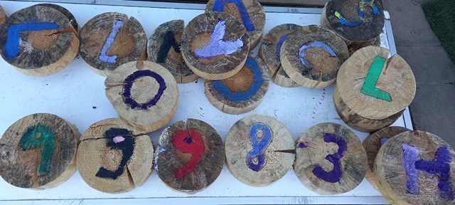 To develop structured learning resources we built a bird hide, enhanced our existing grab bags for outdoor learning, numbered the trees in our forest using wooden discs and created reversible letter and number discs using sustainably sourced wood from a local sawmill.