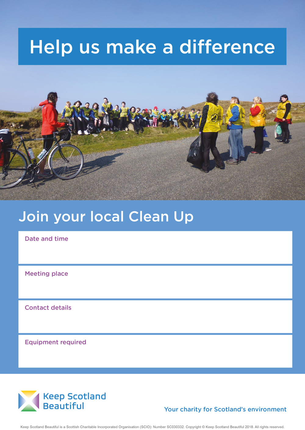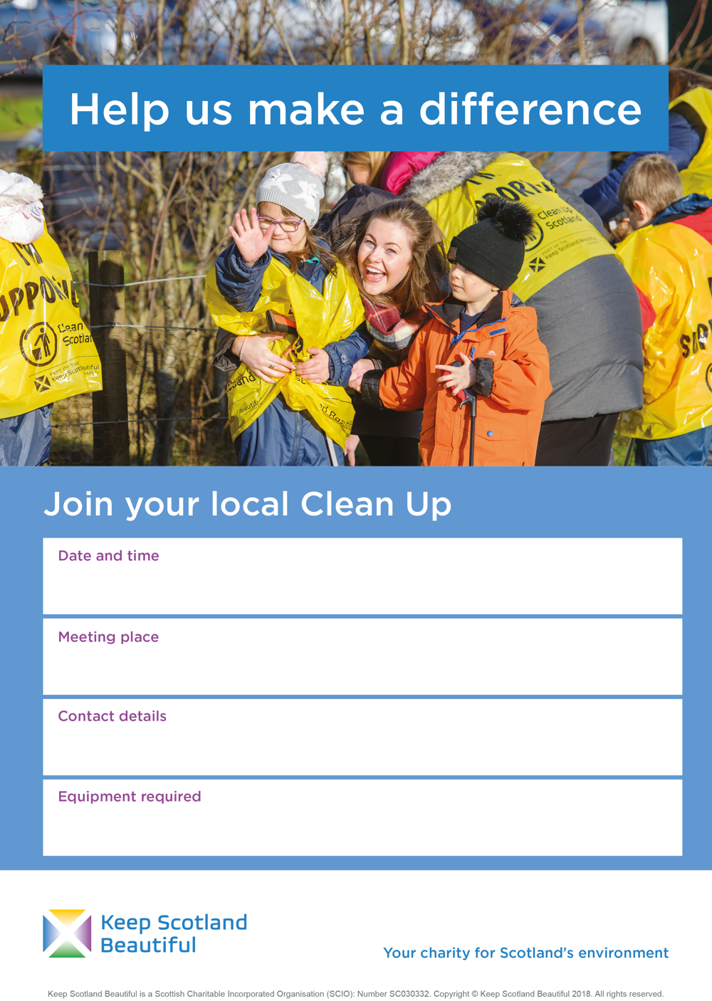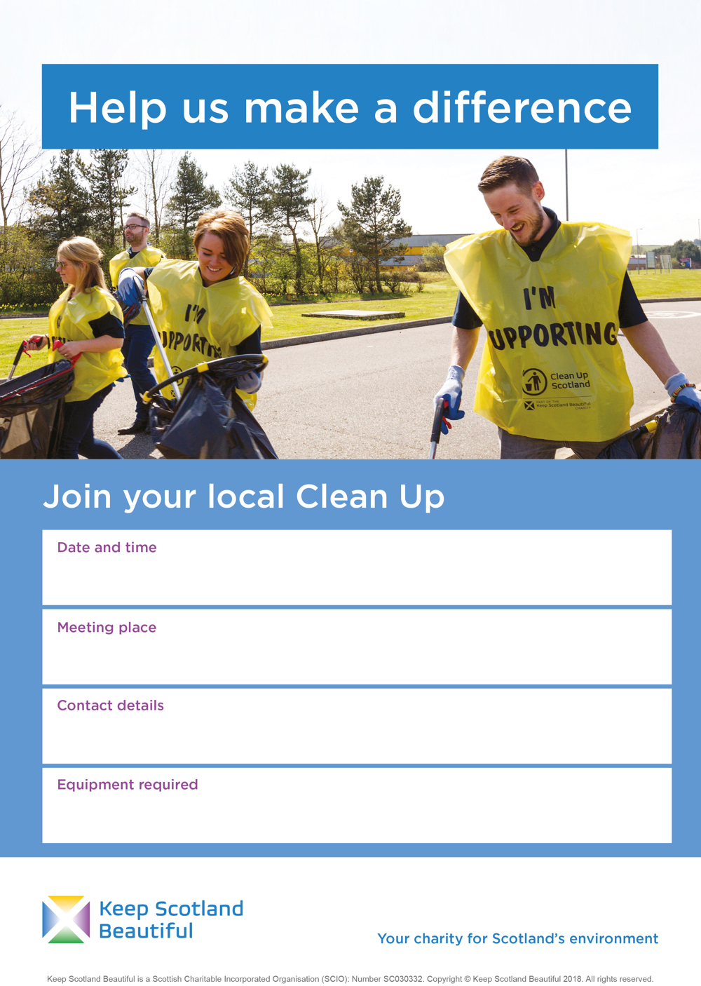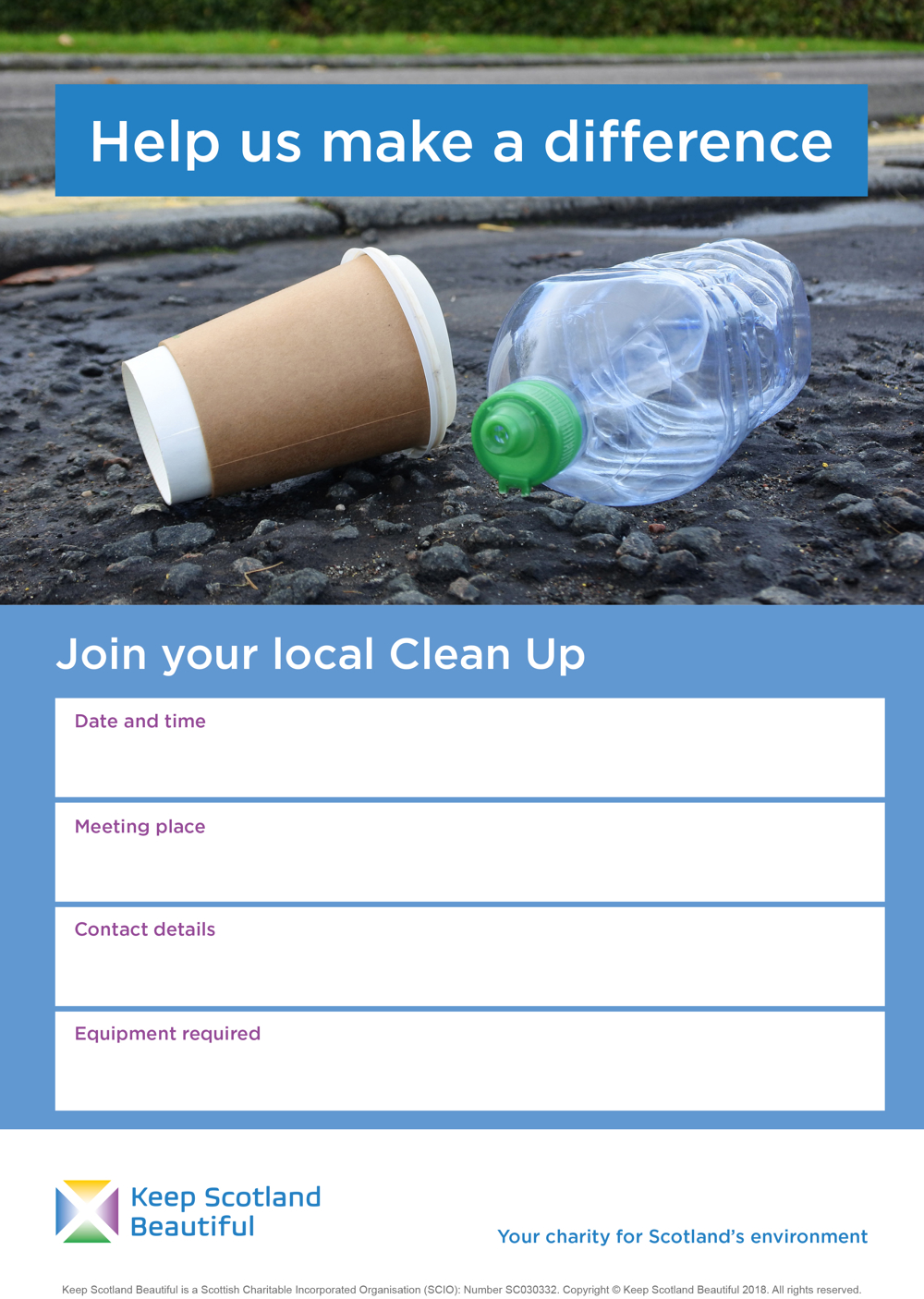 We release bespoke posters and social cards each year with the dates, as well as a Communications Pack to provide guidance and support to promote local spring clean activities. Keep an eye on our Spring Clean Scotland page for these. See below for our more generic Spring Clean social cards.