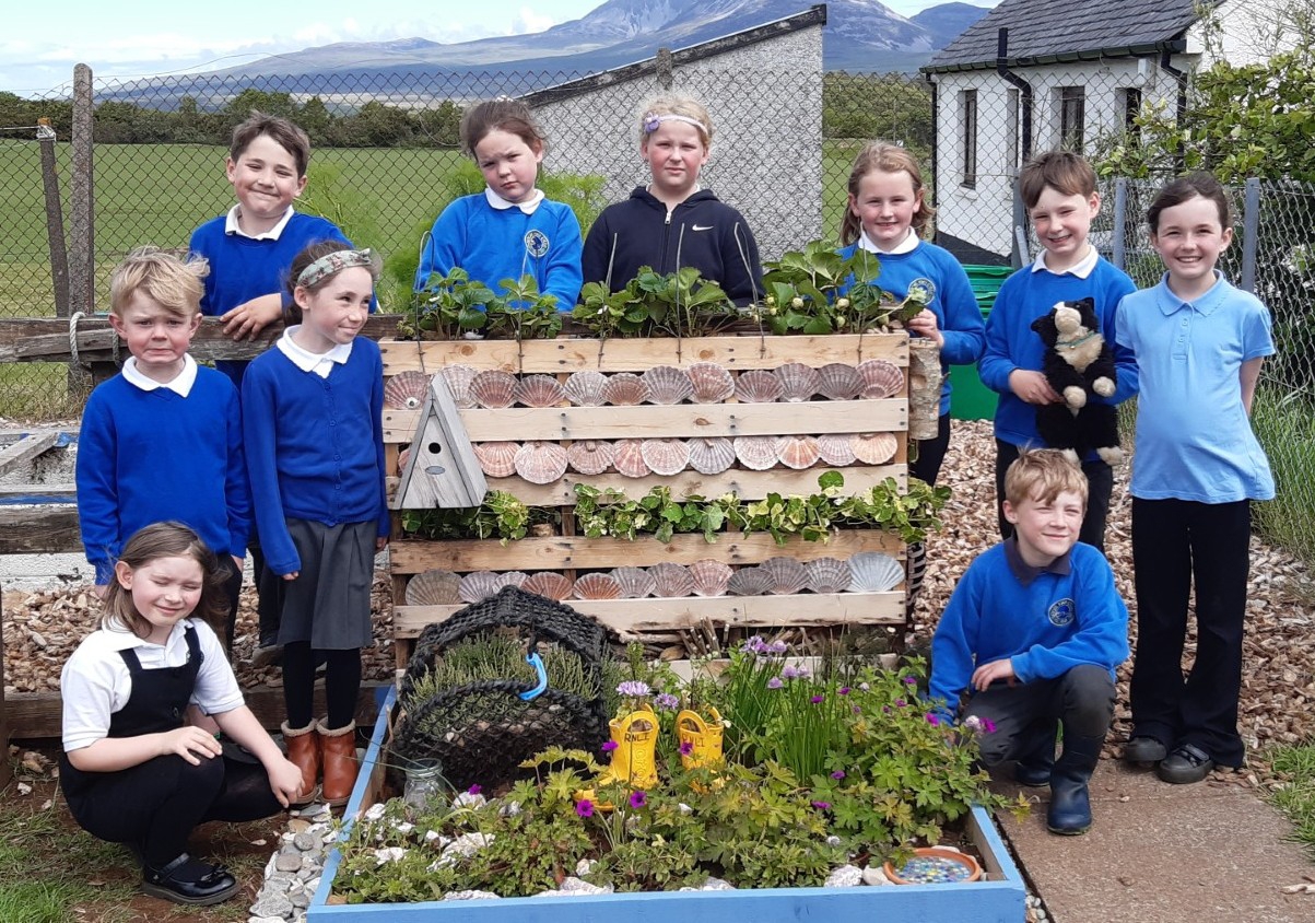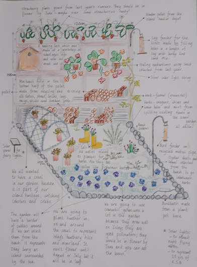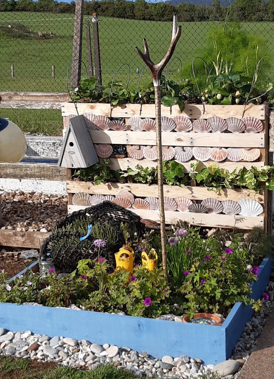 We wanted our garden to represent life on our island home of Islay. We put beach pebbles around it to represent the shoreline. We used empty oyster shells in between plants to help to stop weeds growing up and also because there is an oyster farm on Islay. We have used scallop shells to cover the planting pockets in the vertical part of the garden. We have included an old lobster and crab creel to represent our fishing heritage and it can also be a hill in the garden to represent the heathery hills and moorlands on Islay. The bird feeder uses deer horns. We have included a pair of old yellow wellies to represent the RNLI and Islay Lifeboat and because fishermen’s boots are yellow.