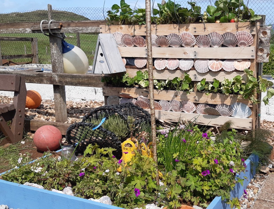We wanted our garden to represent life on our island home of Islay. We put beach pebbles around it to represent the shoreline. We used empty oyster shells in between plants to help to stop weeds growing up and also because there is an oyster farm on Islay. We have used scallop shells to cover the planting pockets in the vertical part of the garden. We have included an old lobster and crab creel to represent our fishing heritage and it can also be a hill in the garden to represent the heathery hills and moorlands on Islay. The bird feeder uses deer horns. We have included a pair of old yellow wellies to represent the RNLI and Islay Lifeboat and because fishermen’s boots are yellow.