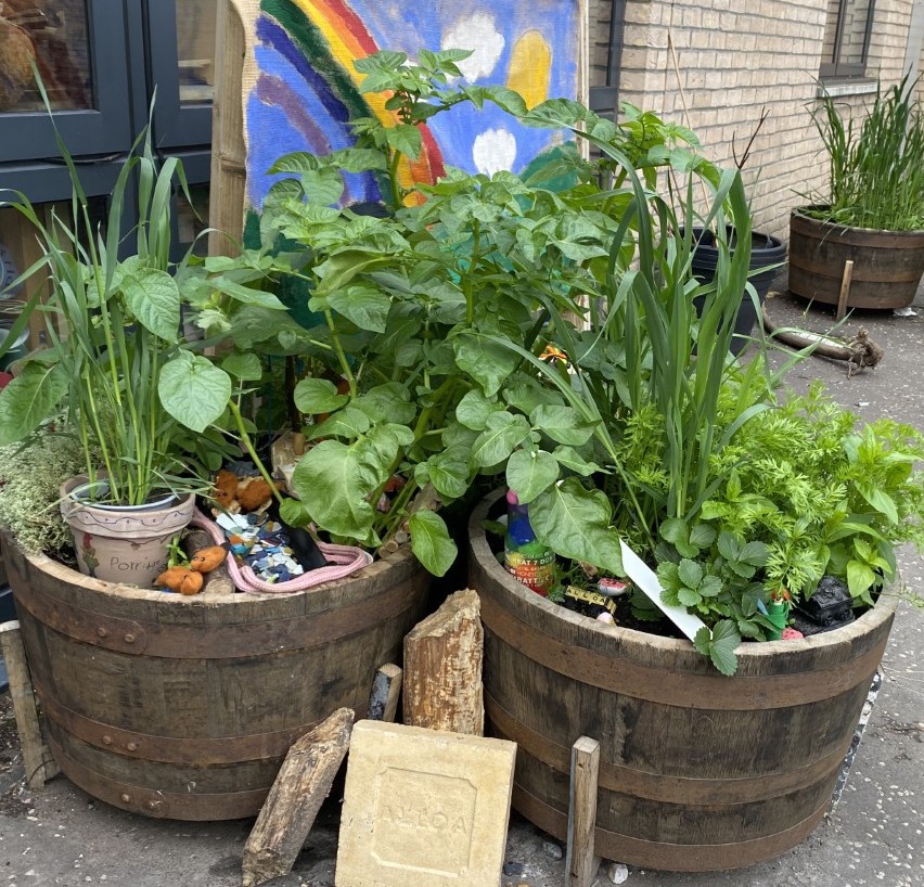 Our garden is full of hidden magic and surprises. See if you can spot references to Alloa’s cultural, built, industrial and natural heritage among the plants. Our garden is built across 3 whisky barrels donated by a local cooper and a brick from the old brickworks takes pride of place at the front, next to some gnawed branches from our neighbourhood beavers.