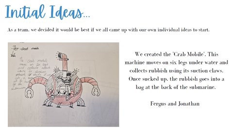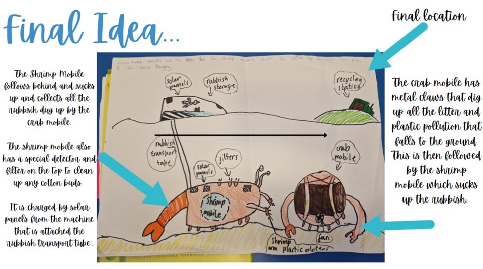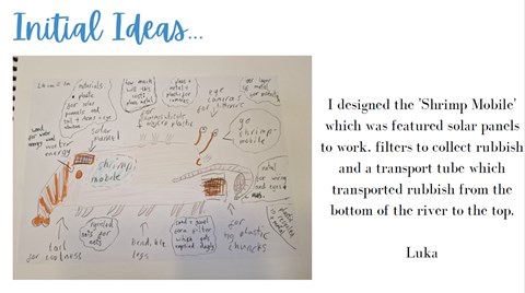The group then created a Shrimp Mobile and Crab Mobile design of two solar powered drones that scour the riverside for dropped litter and collect it for recycling.