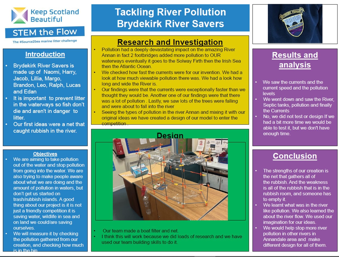 Originally, the Brydekirk River Savers were 3 small groups, all with differing ideas, but came together when they recognised that if they took each groups initial design and merging ideas together, an amazing creation would be made to tackle the issue of source to sea pollution.