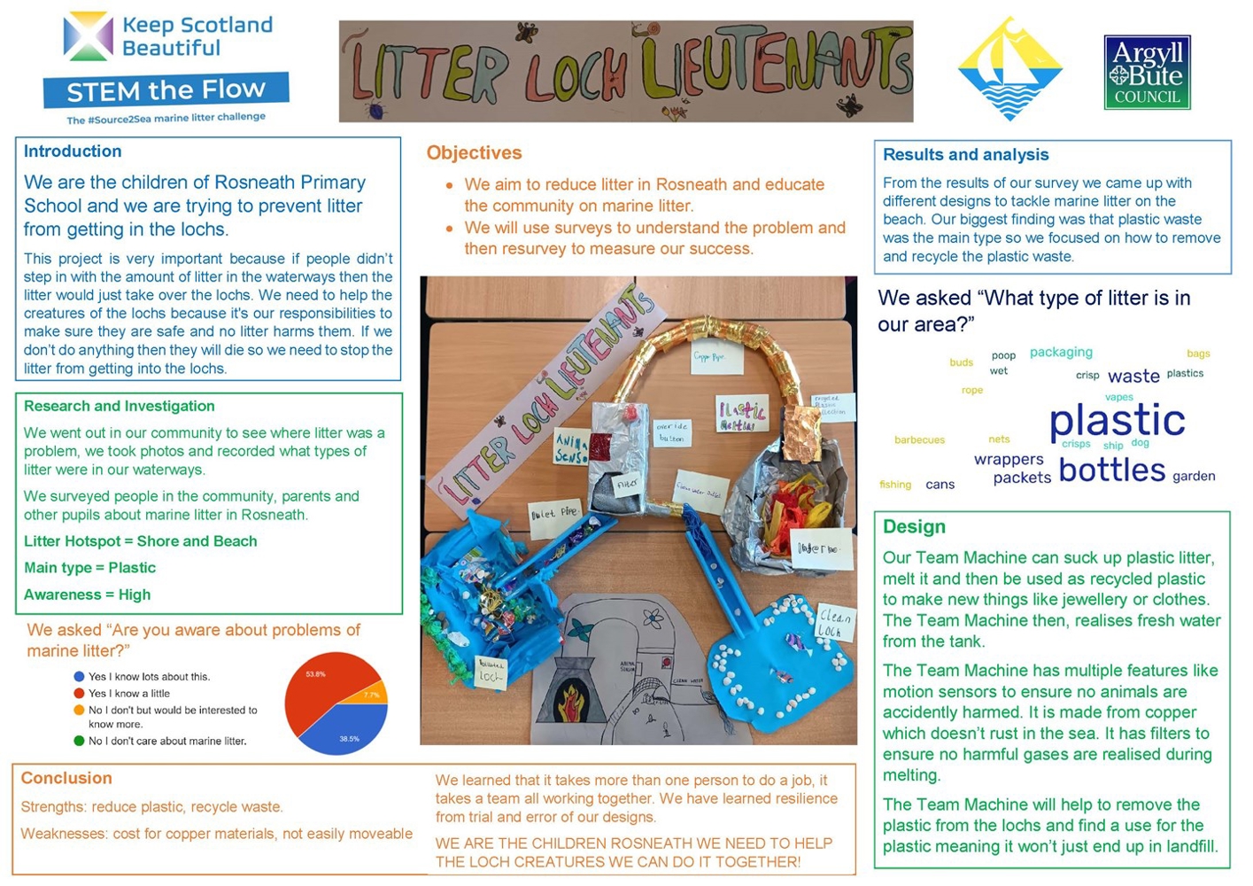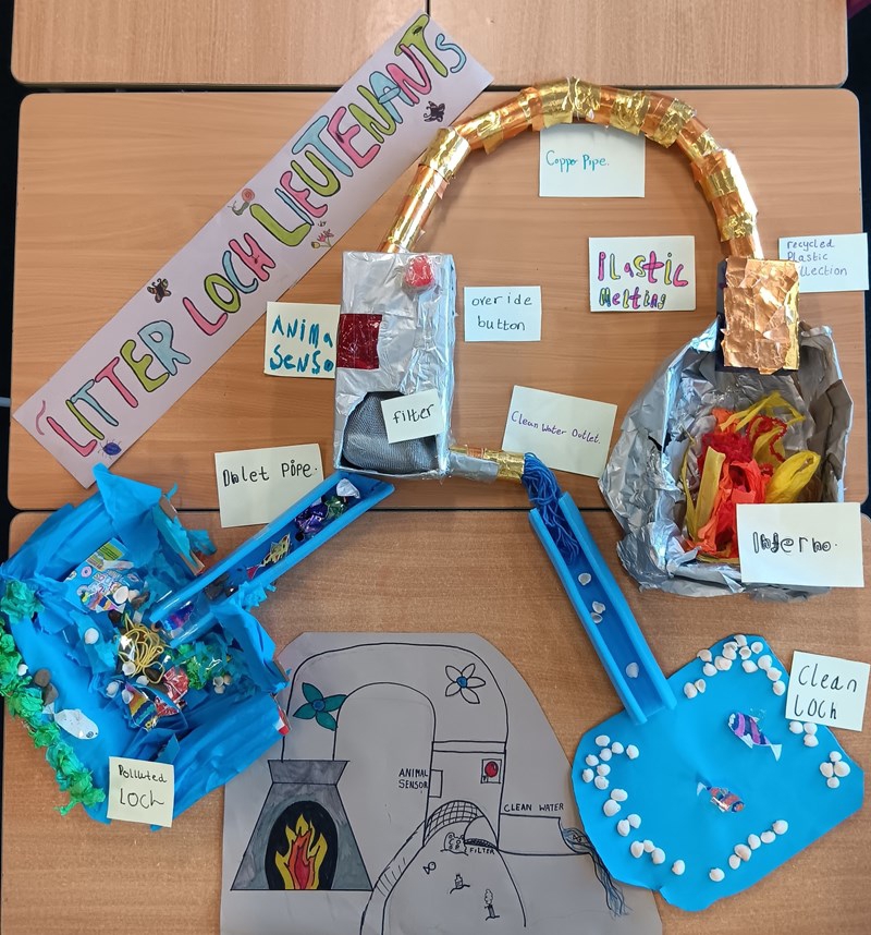 As a class they discussed the results of the survey and decided there were some good suggestions of ways to reduce litter in Rosneath. Each pupil then came up with ideas, drawings and initial designs. The class split into five groups and developed the ideas into five designs. They then voted on which design to take forward. Next they looked at the final design in detail, asking questions about strengths and weaknesses. They made changes where possible and created a model of the final design.