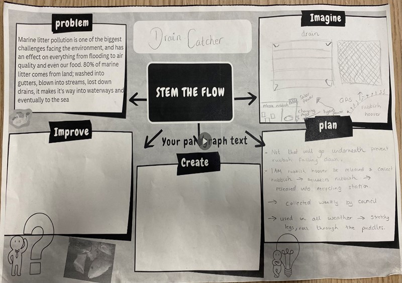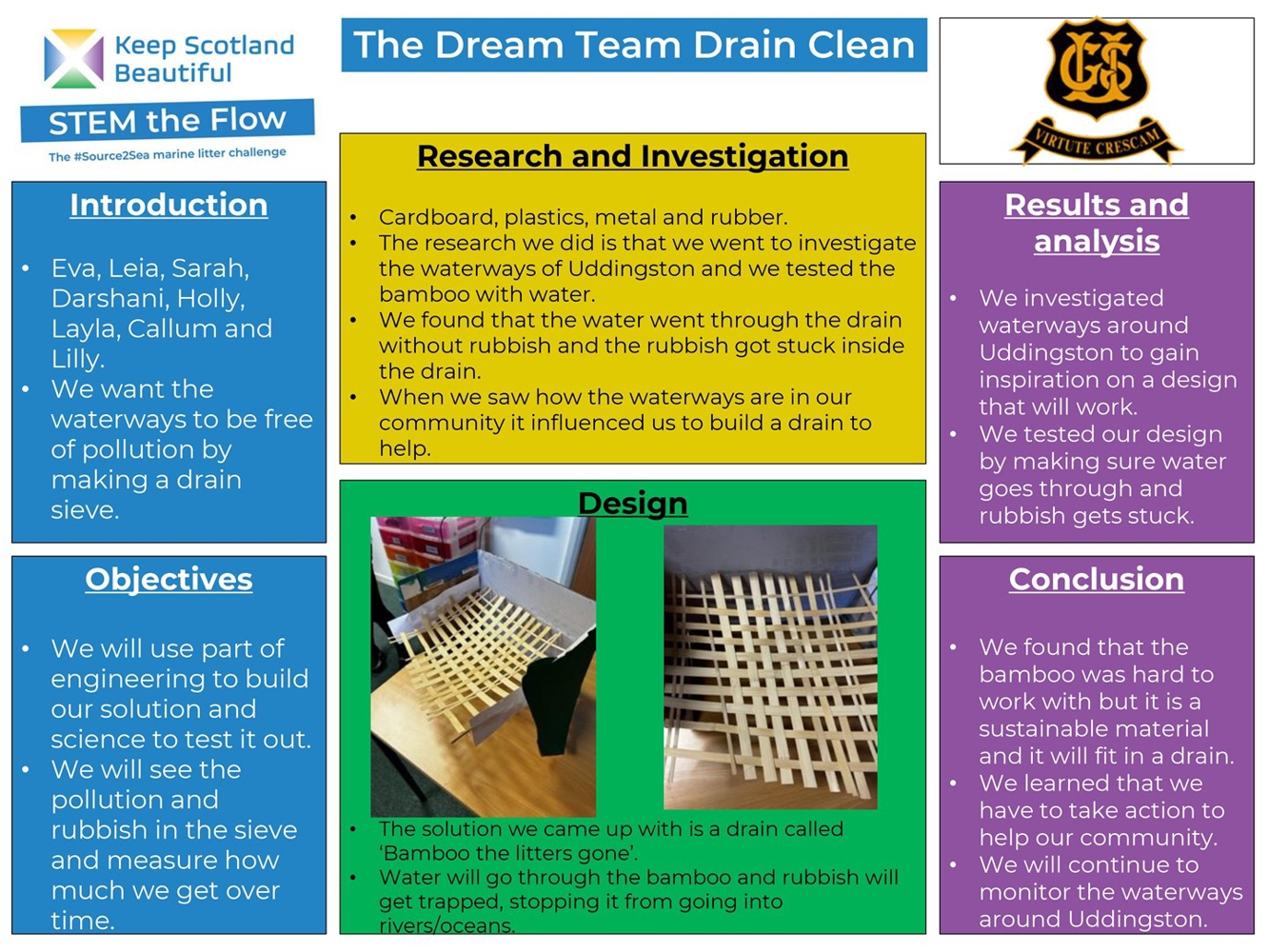 Pupils were very inspired by this project and started by investigating the local waterways around Uddingston. They were shocked to see how much litter was in local streams, drains and rivers. They decided to focus on drains as Uddingston is a built-up area. They noticed that the current casing on drains was allowing litter to pass through and into waterways.